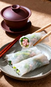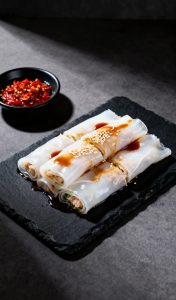 传统要求十三道褶,形似弯月,入口弹牙间迸发海洋的鲜甜。这是广式点心中最考验师傅功力的“点心之王” 干蒸烧卖:金甲披身玉作心 薄面皮托着七分瘦三分肥的猪肉馅,顶部点缀蟹籽或鲜虾。蒸制时肉汁渗入面皮,成就了这枚“会呼吸的烧卖” 肠粉:白绢漫卷现琼瑶 米浆在蒸笼里化作素绢,包裹鲜虾、牛肉或油条。淋上特制酱油,入口爽滑如丝绸过喉,是广式早茶中最具诗意的创造